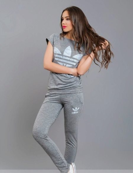 เซ็ตหน้าร้อนสีเทาชุดแรกประกอบด้วยเสื้อยืดแบรนด์เนมและกางเกงถักแบบสบายสวมใส่สไตล์ "สปอร์ตชิค" ภาพดูมีสไตล์เนื่องจากขาดรายละเอียดที่ไม่จำเป็นการตัดที่กระชับและการปรากฏตัวของตราสินค้า Adidas บนเสื้อผ้า รองเท้าผ้าใบสีขาวคลาสสิกเติมเต็มความเป็นกลางของเฉดสีของชุด ในชุดสูทคุณไม่เพียง แต่ทำแบบฝึกหัดเพื่อสร้างรูปร่างที่กระชับ แต่ยังไปเดินเล่น