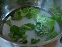- ใบสะระแหน่สดหนึ่งแก้วจะถูกถ่ายโอนไปยังกระทะ