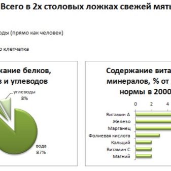 ส่วนผสมที่สำคัญที่สุดในน้ำมันหอมระเหยคือเมนทอล (50–90%) น้ำมันใบของพืชมีน้ำมันหอมระเหยจากเมนทอลพร้อมกรด (อะซิติกและ valerian) น้ำมันไขมัน (20%) มีอยู่ในเมล็ด