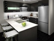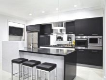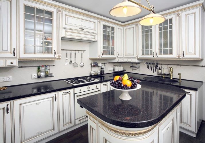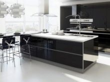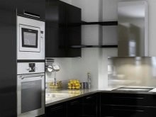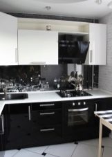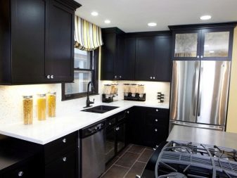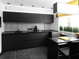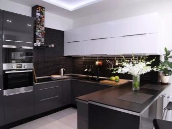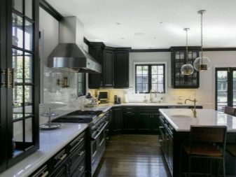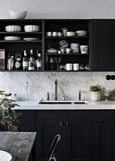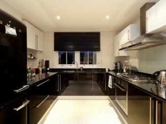 ตัวเลือกที่น่าสนใจคือห้องครัวสีเข้มในขาวดำ สีตรงข้ามสองสีนี้สร้างการรวมที่น่าสนใจ ในห้องครัวที่หน้าต่างหันไปทางทิศเหนือคุณต้องพยายามใช้เฉดสีอ่อน ๆ และเข้มขึ้นเพื่อออกแบบเม็ดมีดแต่ละอัน ในการออกแบบดังกล่าวต้องมีการส่องสว่างที่ซ่อนอยู่ ส่วนใหญ่แล้วในการออกแบบเพดานและตู้เย็นจะปรากฏเป็นพื้นหลังสีขาวตู้พื้นและผนังทำสีเข้ม