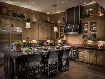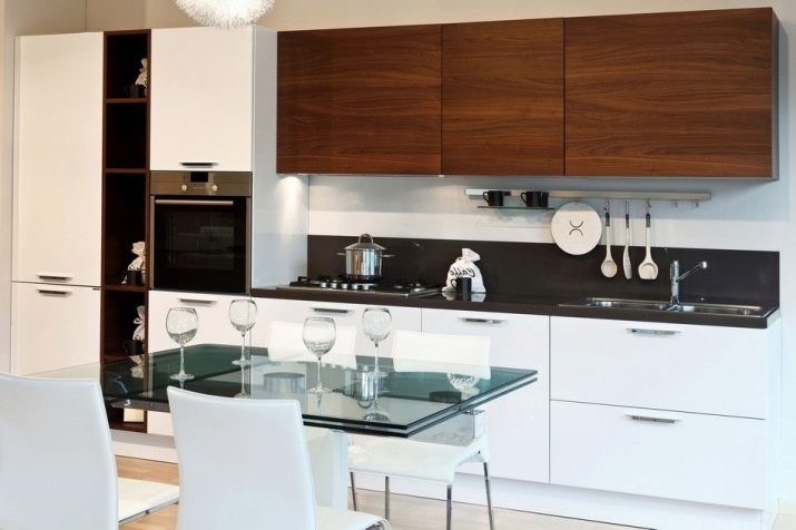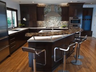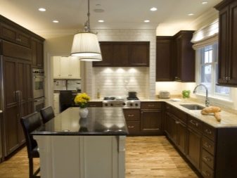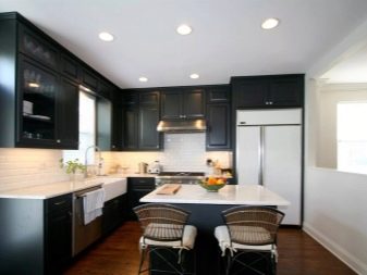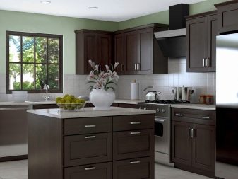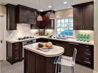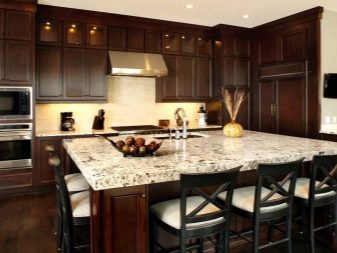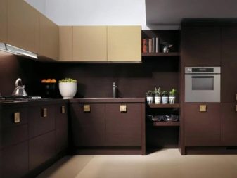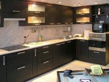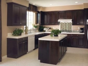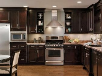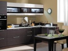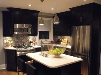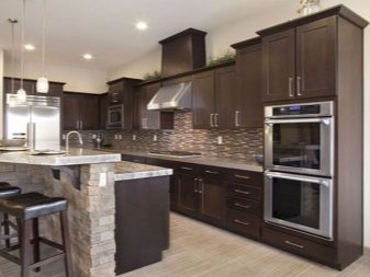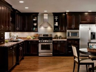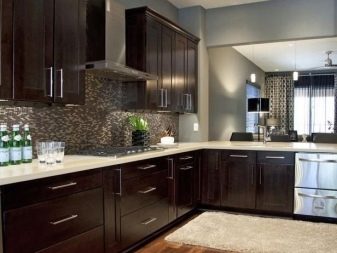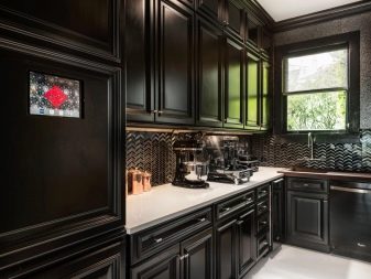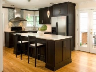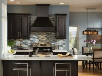 นักออกแบบส่วนใหญ่เมื่อเร็ว ๆ นี้เลือกที่จะสร้างโครงการครัวในเฉดสีเข้มเนื่องจากดูแปลกตาและทันสมัย ในการดำเนินโครงการดังกล่าวสามารถนำแนวคิดต่าง ๆ มาใช้โดยคำนึงถึงความชอบส่วนตัวของเจ้าของบ้าน ตัวอย่างเช่น ถ้าห้องมีขนาดเล็กแล้วสำหรับการออกแบบคุณสามารถเลือกสีของดาร์กช็อกโกแลตได้. ในรุ่นนี้ห้องครัวจะเต็มไปด้วยบรรยากาศของความสะดวกสบาย เฟอร์นิเจอร์ในกรณีนี้ควรเลือกโทนเบากว่า