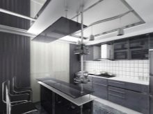 ในห้องครัวขนาดเล็กมันจะน่าสนใจที่จะดูการผสมผสานของการออกแบบที่โปร่งใสและสีเข้มในการตกแต่งซึ่งมักจะเหมาะสำหรับสไตล์ไฮเทค ในกรณีนี้มีความจำเป็นต้องจัดเรียงผนังและพื้นในสีเทาเข้มติดตั้งเพดานยืดสีขาว ในการตกแต่งภายในเครื่องใช้เหล็กสีดูดี สำหรับชุดครัวมันสามารถนำเสนอในการปรับเปลี่ยนต่างๆ สิ่งสำคัญคือโมดูลที่มีการติดตั้งประตูโปร่งใส สำเนียงหลักในห้องครัวจะเป็นโต๊ะกระจกซึ่งสามารถเสริมด้วยผ้าปูโต๊ะ openwork