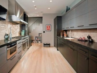 - สองบรรทัด พวกเขาถูกเลือกสำหรับห้องครัวขนาดเล็กและยาวซึ่งประตูตั้งอยู่ตรงข้ามหน้าต่าง ชุดที่ติดตั้งในแบบคู่ขนานไปตามผนังสองด้าน