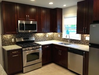 - รูปตัว L เหมาะสำหรับห้องครัวทุกขนาด ด้วยโครงร่างนี้ชุดหูฟังจะถูกวางตามแนวกำแพงทั้งสองซึ่งตั้งฉากซึ่งกันและกัน กล่องใส่ดินสอและตู้เก็บของมักจะวางอยู่ตามผนังยาว หากห้องครัวเป็นเหลี่ยมมุมตู้แขวนผนังควรเติมพื้นที่มุมให้เต็มในขณะที่รักษาพื้นที่ว่างไว้ในห้อง