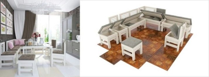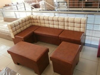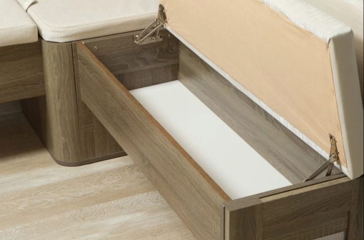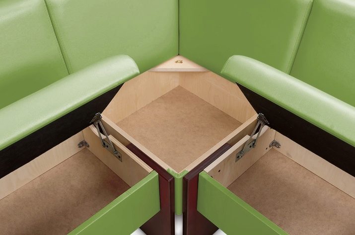 ด้วยความช่วยเหลือของโมดูลดังกล่าวคุณจะสามารถเปลี่ยนมุมของห้องครัวและไม่เพียง แต่รับแขกเท่านั้น แต่ยังสามารถพับเครื่องครัวหรือ Gizmos อื่น ๆ เป็นลิ้นชักในตัวแบบพิเศษใต้ที่นั่ง