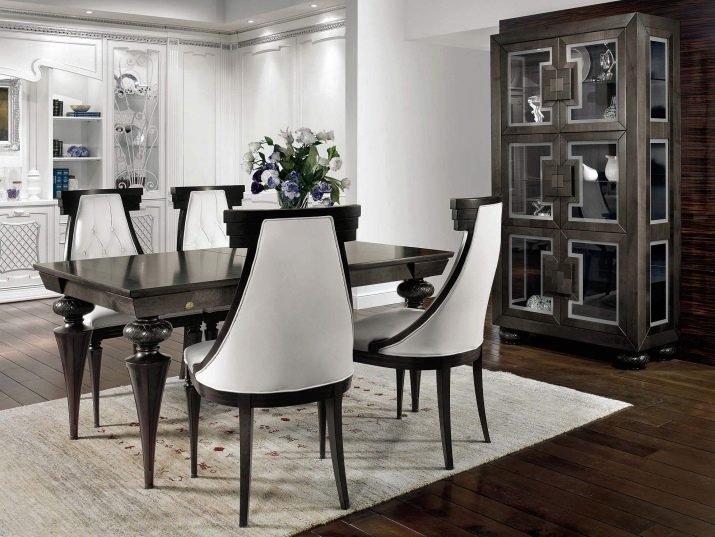 ภาพด้านล่างแสดงตัวอย่างของการตกแต่งภายในห้องนั่งเล่นแบบคลาสสิกที่กลุ่มการรับประทานอาหารได้รับการออกแบบในสีดำและสีขาว เก้าอี้หนังสุดหรูที่ลงตัวในภาพรวม