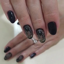 เทคนิคม่านเป็นที่นิยมมากบนเล็บรูปไข่มันดูเป็นผู้หญิงโดยเฉพาะและสง่างาม วันนี้ไม่จำเป็นต้องวาดเส้นขอบรูปร่างบนพื้นหลังดังกล่าว การออกแบบสามารถทำได้บนผ้าคลุมหน้าของตัวเอง สมมติว่ามันจะมีลักษณะเป็นลอนลูกไม้อะครีลิคและ monograms ที่สวยงามรวมถึงแนวตั้งที่มีพื้นผิวด้านและการฝังแบบเรียบง่าย