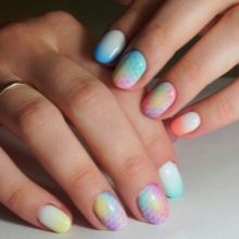 ภาพวาดผง, monograms, ดอกไม้, รูปแบบการถักนิตติ้งสามารถสร้างขึ้นโดยการรวมแจ็คเก็ตหรือการออกแบบดวงจันทร์กับคลาสสิก การวาดภาพเจลขัดบนพื้นหลังสีและโรยด้วยผงอะคริลิคคุณสามารถสร้างการออกแบบที่เป็นเอกลักษณ์ของเล็บที่จะไม่ไปสังเกต ในเวลาเดียวกันมันเป็นแฟชั่นที่จะดำเนินการพิมพ์ในหลายสีหรือเลียนแบบการไล่ระดับสี