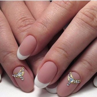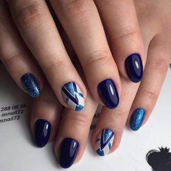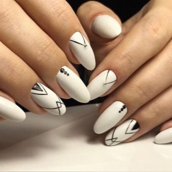 สำหรับการออกแบบดวงจันทร์บนรูปร่างรูปไข่มันดูดี ในกรณีนี้คุณสามารถเอาชนะการออกแบบด้วยรูปสามเหลี่ยมต่างๆยืดออกจากฐานของแผ่นเล็บไปจนถึงส่วนบนสุดของขอบรก เต็มไปด้วยทองคำหรือเงินพวกเขาจะดูน่าประทับใจมากเมื่อเทียบกับพื้นหลังของการเคลือบแบบพูดน้อย และที่นี่คุณสามารถใช้เทคนิคลบพื้นที่ซึ่งในส่วนของเล็บไม่ได้ทาสีเลย