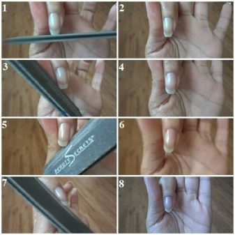 ความยาวถูกเลือกโดยเล็บที่สั้นที่สุด มันเป็นสิ่งสำคัญที่จะต้องพิจารณาว่าในเล็บทั้งหมดควรมีลักษณะเดียวกัน คุณต้องใช้ตาของคุณเองคุณไม่สามารถเก็บเล็บไว้นานเกินไปและทิ้งไว้แม้ว่าจะมีเพียงแค่รอยแตกเดียวเท่านั้น มีความจำเป็นต้องใช้ไฟล์ในที่ทำงาน ในเวลาเดียวกันการเคลื่อนไหวของเธอควรถูกนำไปในทิศทางเดียวเท่านั้น การเพิกเฉยต่อความแตกต่างนี้จะนำไปสู่การหลุดออกของเล็บและหลุดออกจากการเคลือบอย่างรวดเร็ว ไฟล์ถูกบีบให้แบนโดยคำนึงถึงเล็บและเคลื่อนไปในทิศทางจากฐานของเล็บไปที่ขอบในขณะที่พยายามทำให้แน่ใจว่าไฟล์นั้นละเอียดอ่อน