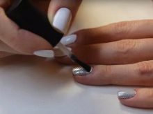 - สำหรับเล็บที่เตรียมไว้ล่วงหน้าการเคลือบขั้นพื้นฐานจะถูกนำไปใช้จากนั้นเคลือบเงาที่ไม่มีสีหรือสีขึ้นอยู่กับการออกแบบที่เลือก
