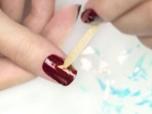 - ในระยะแรกแผ่นเล็บควรถูกปกคลุมด้วยฐานและจากนั้นเคลือบด้วยน้ำยาวานิชสีซึ่งจะทำหน้าที่เป็นพื้นหลัง สำหรับผู้เริ่มต้นไม่แนะนำให้เลือกเฉดสีนู้ดเนื่องจากจะทำให้มองเห็นได้ชัดเจนยิ่งขึ้น