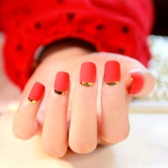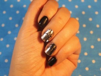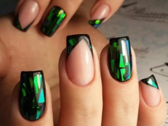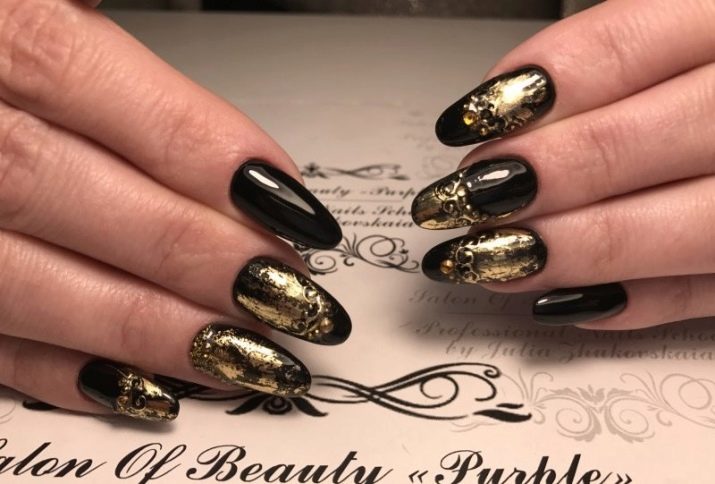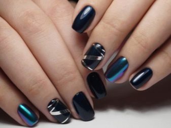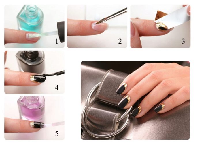 - หนุนฟอยล์ สีทองหรือสีเงินของฟอยล์ซึ่งมองตามรูปร่างของแผ่นเล็บจากใต้สีหลักดูสง่างามอย่างไม่น่าเชื่อ ตัวเลือกนี้ทำให้การทำเล็บสีดำหรือสีน้ำเงินลึกและเป็นผู้หญิงมากขึ้น