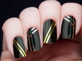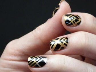 แถบของกระดาษฟอยล์วาดเส้นบนพื้นหลังใด ๆ รูปทรงเรขาคณิตสีทองดูเป็นประโยชน์ในการแต่งเล็บสีดำ การแต่งเล็บนั้นเรียบง่าย แต่มีความหรูหรา