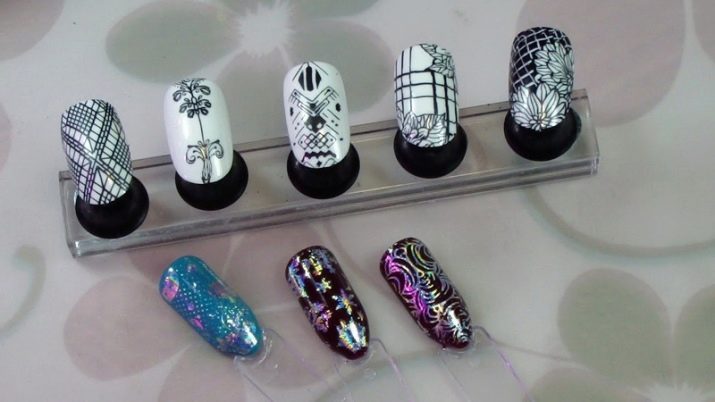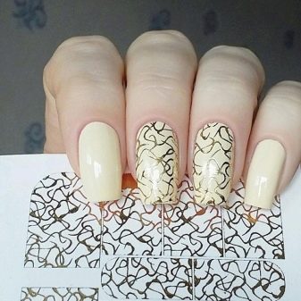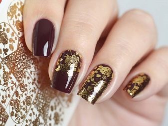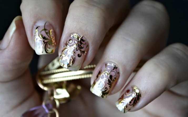 การออกแบบดั้งเดิมทำโดยใช้เทคนิคการปั๊ม วิธีการประกอบด้วยความจริงที่ว่าภาพวาดไม่ได้ถูกสร้างขึ้นใหม่บนเล็บ แต่ในซิลิโคนพิเศษที่ว่างเปล่า หลังจากการอบแห้งจะถูกนำไปใช้กับแผ่นเล็บและคงที่ ภาพวาดโปร่งแสงดังกล่าวเข้ากันได้อย่างสมบูรณ์แบบบนพื้นหลังฟอยล์สีทอง
