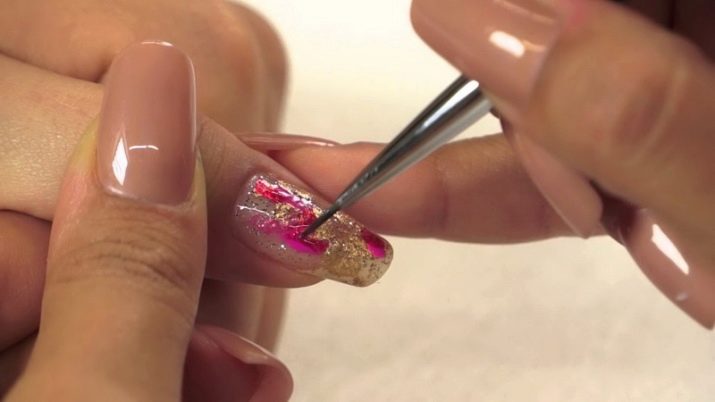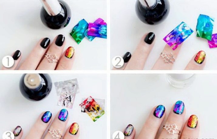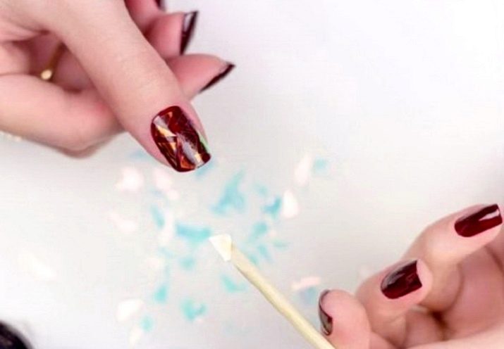 - ฟอยล์วางบนชั้นแห้งด้วยแหนบตามรูปแบบที่เลือก แต่ละชิ้นควรกดที่เล็บให้เรียบในทิศทางที่ต่างกันด้วยการทำเล็บพิเศษหรือสำลีก้าน