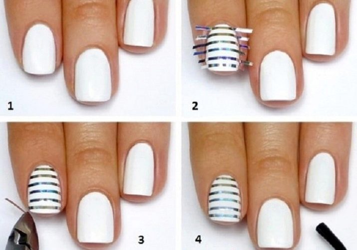 - จากนั้นแถบที่มีขนาดและสีที่ต้องการควรถูกตัดจากฟอยล์ ก่อนหน้านี้คุณสามารถประเมินตำแหน่งของพวกเขาบนเล็บ