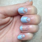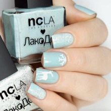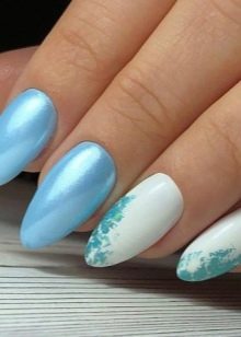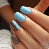 - การออกแบบฟอยล์บนเล็บสำเนียง การรวมกันของสีฟ้าอ่อนกับครีมในการทำเล็บคลาสสิก