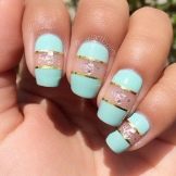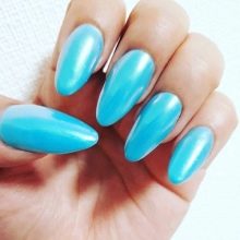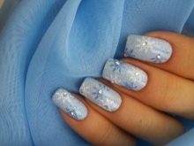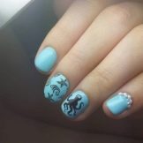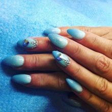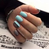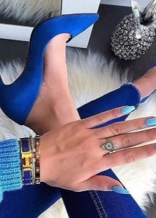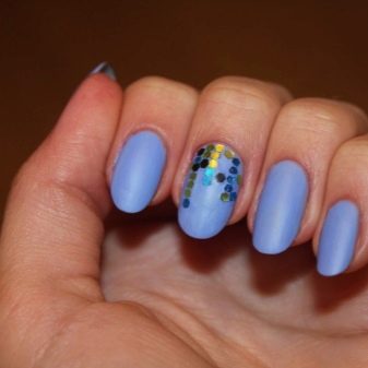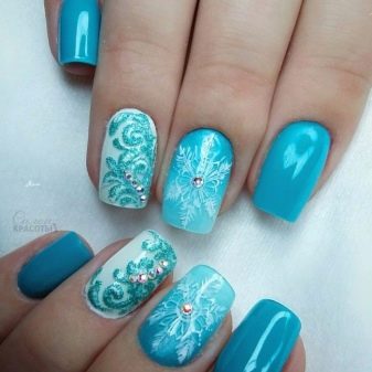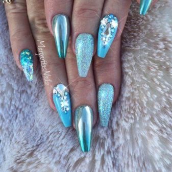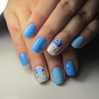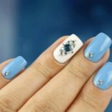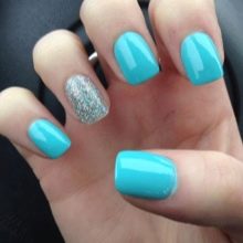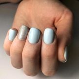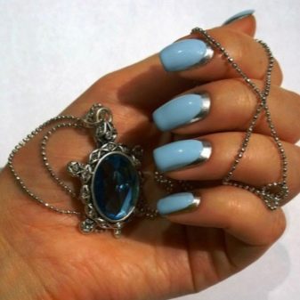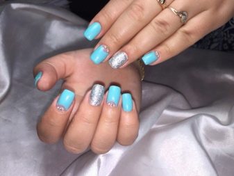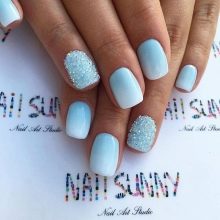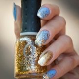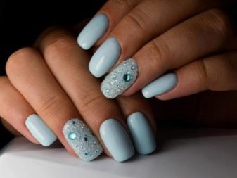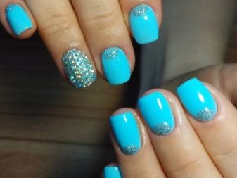 การเลือกประกายเป็นพื้นฐานสำหรับการตกแต่งคุณต้องเข้าใจ: หากไม่มีปริมาณการตกแต่งนี้สามารถละเมิดความกลมกลืนของการออกแบบเล็บในโทนสีฟ้า ความเงางามมากมายในทุกวันนี้นั้นไม่เกี่ยวข้องและนอกจากนี้แผ่นเล็บที่ถูกคลุมไว้อย่างสมบูรณ์อาจทำให้สูญเสียการแสดงออกของเล็บที่มีสำเนียงได้ อย่างไรก็ตามการวาดทองหรือเงินเดียวกันจะค่อนข้างเหมาะสม เขาดีกว่าที่จะมอบความหรูหราให้กับเล็บและช่วยเน้นเสียงของเล็บ นอกจากนี้เลื่อมมีมากมายไม่เหมือน rhinestones และคริสตัล