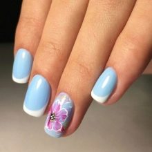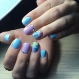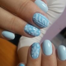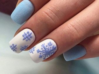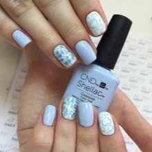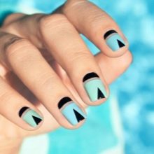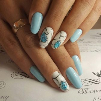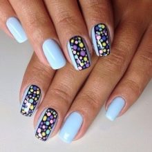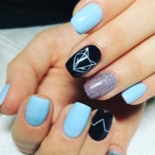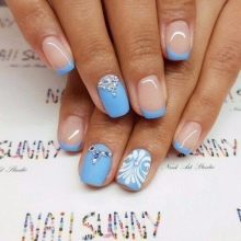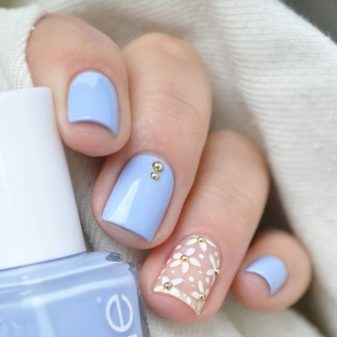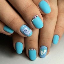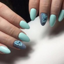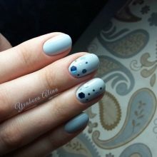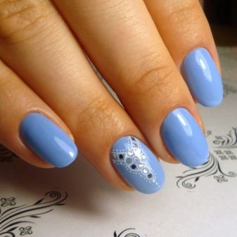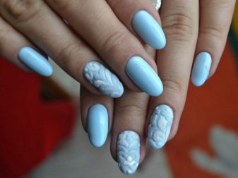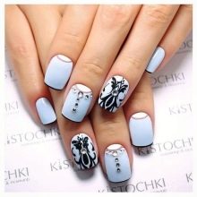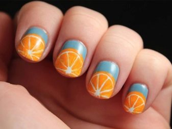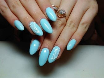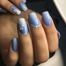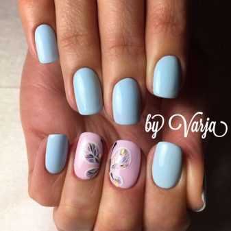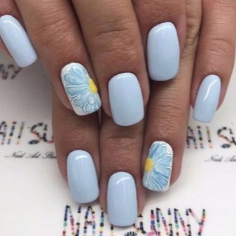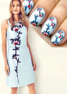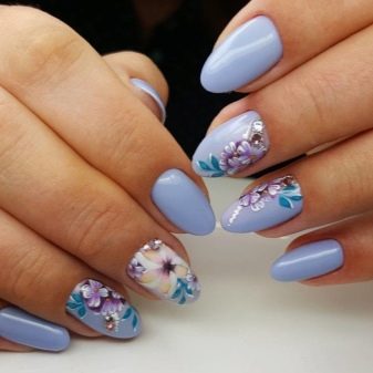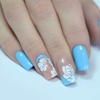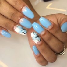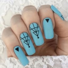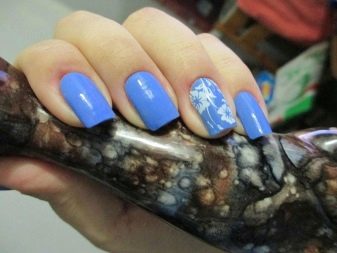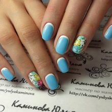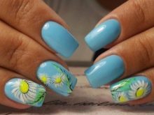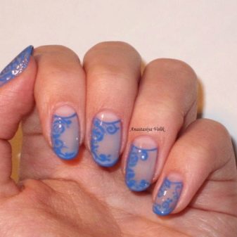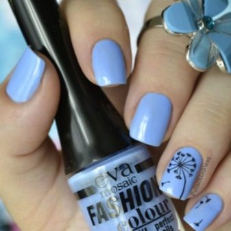 การวาดภาพบนพื้นหลังสีน้ำเงินนั้นต้องคำนึงถึงความรอบคอบของตัวแบบ เป็นสิ่งสำคัญที่จะไม่รบกวนการรับรู้สี ดูอย่างมีสไตล์บนพื้นฐานนี้ภาพวาดที่ทำในสีเดียวกันในเทคนิคการร่างภาพ ในกรณีที่ไม่มีทักษะการวาดคุณสามารถตกแต่งพื้นผิวของเล็บด้วยลายเส้นหรือถั่วธรรมดา (จุด) ธีมผักกำลังเป็นที่นิยม ดอกแดนดิไลอันแท้จริง, เครื่องประดับชาติพันธุ์, กิ่งไม้, ใบไม้, ขนนก