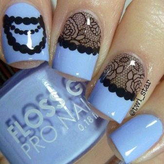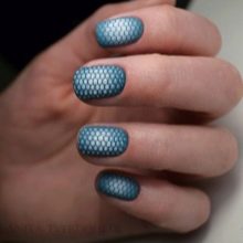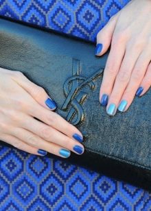 การทำเล็บสีน้ำเงินเป็นหนึ่งในเทรนด์ของฤดูกาลนี้ บรรลุผลของถุงน่อง kapron ดังนี้: เม็ดสีเจือจางด้วยสารเคลือบเงาที่ชัดเจนและทาสีเล็บ จากนั้นพวกเขาจะตกแต่งตามดุลยพินิจของพวกเขาและปกคลุมด้วยชั้นของผลิตภัณฑ์ขั้นสุดท้าย การออกแบบนี้ดูมีสไตล์อย่างไม่น่าเชื่อ ในขณะเดียวกันอาจหมายถึงการใช้สีน้ำเงินไม่เพียง แต่รวมถึงการรวมของสีดำในปริมาณที่น้อยที่สุด