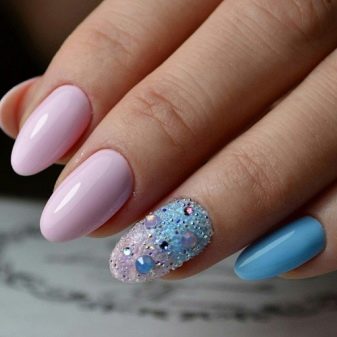Rhinestones ยังไม่สูญเสียความนิยมเหมือนผลึกขนาดใหญ่ อย่างไรก็ตามความอุดมสมบูรณ์ของพวกเขานำความหยาบคายมาสู่การออกแบบ ไม่จำเป็นต้องแสดงให้เห็นถึงความอุดมสมบูรณ์ของการตกแต่งเพราะเพื่อแสดงความเป็นเอกลักษณ์มีประกายระยิบระยับเพียงไม่กี่อันเพียงพอที่จะวางมันไว้ในบริเวณหนังกำพร้า ในกรณีนี้การออกแบบอาจไม่สมมาตร หากเล็บที่มีสำเนียงมีลวดลายอยู่แล้วให้ดูที่ที่หนึ่งประกาย rhinestone สามารถแก้ไขได้ มันอาจเป็นกึ่งกลางของดอกไม้, ตาของสาขา, การตกแต่งบนขนนก ยิ่งประกายระยิบระยับขนาดเล็กเท่าใดก็ยิ่งเหมาะสมเท่านั้น