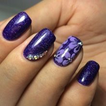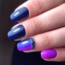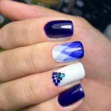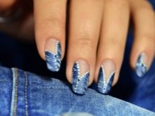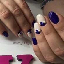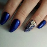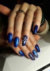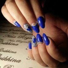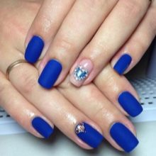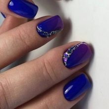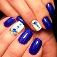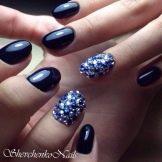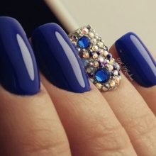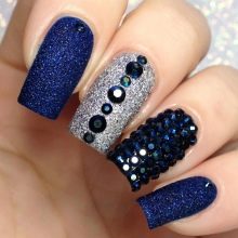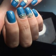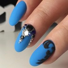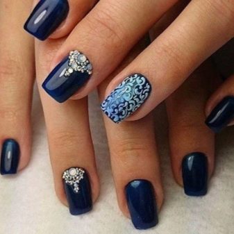 ส่วนประกอบหลักของการทำเล็บสามารถเป็นสีฟ้าในตัวเองหรือใช้ rhinestones กับมัน ในการดำเนินการตัวเลือกที่สองหินหลายก้อนควรจะติดอยู่ในที่สงบและไม่แสดงสีฟ้า ยิ่งไปกว่านั้นพวกมันสามารถถูกจัดวางได้ไม่เพียง แต่ในรูปแบบที่เป็นนามธรรม แต่ยังสร้างภาพที่น่าทึ่งจากพวกเขา (ตัวอย่างเช่น