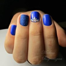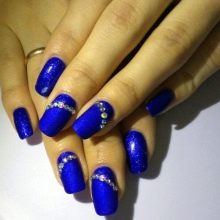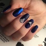 เพื่อให้เล็บของคุณสว่างและกระจ่างใสยิ่งขึ้นให้เพิ่ม rhinestones ลงในวานิช - ในกรณีนี้คุณจะไม่ถูกทิ้งไว้โดยไม่ได้รับคำชมจากผู้อื่น ควรสังเกตว่าสีฟ้าเป็นสัญลักษณ์ค่อนข้าง ตัวอย่างเช่นในศาสนาคริสต์มันหมายถึงจิตวิญญาณและภูมิปัญญา การทำเล็บมือสีน้ำเงินจึงสามารถเก็บข้อความพื้นผิวที่ซ่อนอยู่และทำให้ภาพของคุณดูลึกลับและลึกลับยิ่งขึ้น