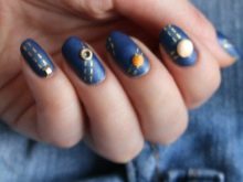 เพื่อสร้างภาพลวงตาของท้องฟ้ายามค่ำคืนที่ลึกลับนั้นมีการเคลือบเงาสีน้ำเงิน - ดำและคริสตัลหรือ rhinestones ในเฉดสีทองบนเล็บ