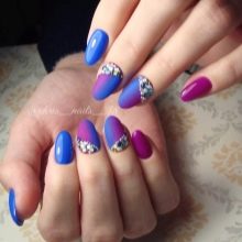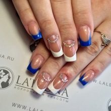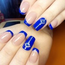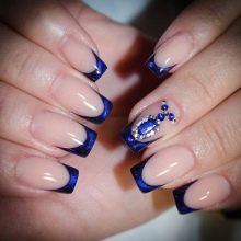 องค์ประกอบของฝรั่งเศสที่ตรงข้าม - ทำเล็บมือดวงจันทร์สามารถทำได้ด้วยความช่วยเหลือของสีน้ำเงินเพิ่ม rhinestone เล็กน้อย (ยิ่งไปกว่านั้นพวกเขาสามารถทำหน้าที่เป็นเส้นขอบบนสำเนียงสีบนเล็บ) หรือกลายเป็น "ตัวละครเอก" ของเล็บและนั่งใกล้ชิดกับศูนย์