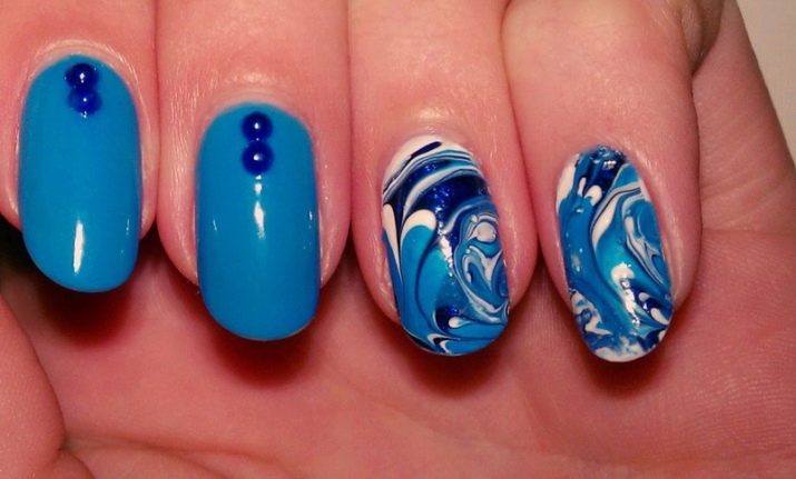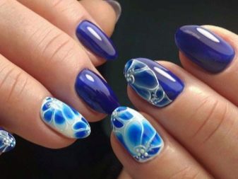 วันนี้แนวโน้มนี้ได้รับความนิยมเท่านั้น มันเป็นของใหม่และมีเวลาอย่างน้อยช่วยให้คุณสามารถตกแต่งเล็บสำเนียงของการทำเล็บสีฟ้าที่มีรูปแบบที่ผิดปกติ ใช้เจลเคลือบเงาพิเศษด้วยเอฟเฟกต์การกระจายหรือการออกดอกสำหรับเทคนิคนี้ วันนี้ยังมีพวกเขาอยู่ไม่กี่คนดังนั้นอาจารย์มักทำงานกับฐานที่โปร่งใสหรือขาว เม็ดสีตัวเองใช้ในจำนวนที่น้อยที่สุด (โดยปกติจะน้อยกว่าหยดที่ใช้ในภาพ) เคลือบเงาดอกมีหลายสีสดใสซึ่งคุณสามารถเลือกสีขาว, สีดำ, สีเขียว, สีฟ้าและสีชมพูสำหรับฐานสีฟ้า