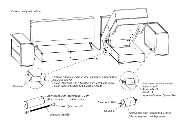 ข้อมูลเกี่ยวกับวิธีการแยกโซฟาอย่างถูกต้องสามารถรับได้ จากวรรณกรรมพิเศษหรืออินเทอร์เน็ต บรรทัดล่างคือ ชิ้นส่วนโครงสร้างทั้งหมดเชื่อมต่อกันโดยรัด หมายเลขและชนิดอาจแตกต่างกันไปขึ้นอยู่กับรุ่นที่ใช้ อย่างไรก็ตามมันจะไม่ผิดที่ชื่อรัดหลักที่พบในเกือบทุกแบบ สิ่งเหล่านี้ ได้แก่ สลักเกลียวถั่วสกรูและสกรูรวมถึงสิ่งที่เรียกว่า Euro-screws หลังมีความโดดเด่นด้วยการแกะสลักเช่นเดียวกับสกรูตัวเองเคาะ