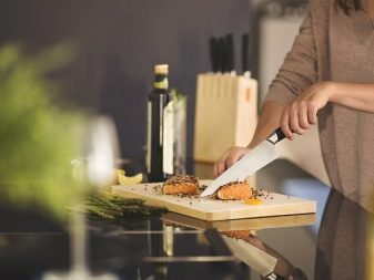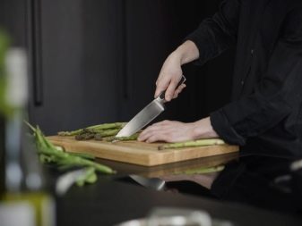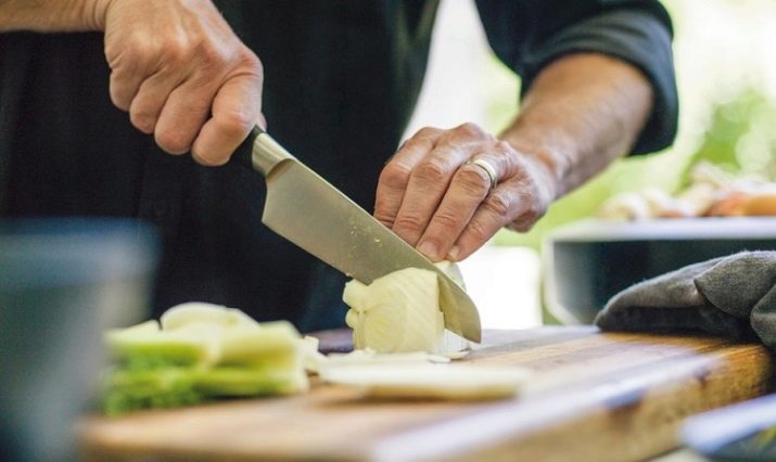 - ใบมีดที่กว้างเป็นสิ่งจำเป็นสำหรับการตัดผลิตภัณฑ์บนกระดาน ความสูงของใบมีดไม่อนุญาตให้มือกระแทกพื้นผิวของคณะกรรมการตัด คุณสามารถซื้อมีดเชฟสากลญี่ปุ่นหรือคลาสสิค