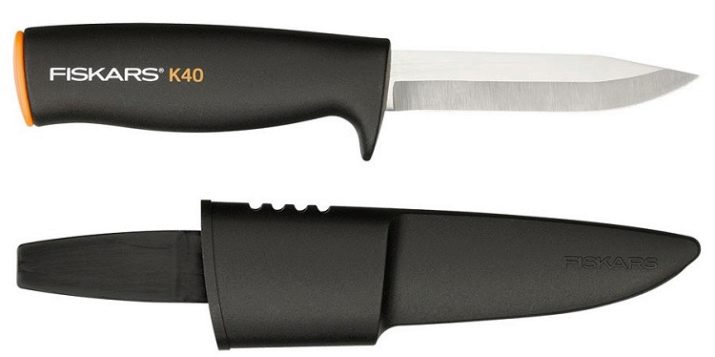 - Fiskars Utility Knife K40 รุ่นนี้สามารถใช้สำหรับบ้านและในระหว่างการเดินทาง ผลิตภัณฑ์ที่โดดเด่นด้วยความคมชัดและใบมีดสแตนเลส มีดมีด้ามจับตามหลักสรีรศาสตร์พร้อมฟิวส์พิเศษ มาพร้อมฝาปิดพลาสติกสำหรับขาย ความยาวใบมีดคือ 100 มม. พร้อมที่จับ 225 มม. น้ำหนักรวมของโครงสร้างคือ 70 กรัม
