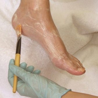 - มีการใช้น้ำยาล้าง - สารพิเศษที่ช่วยให้คุณรับมือกับข้าวโพดรอยแตกและผิวที่หยาบกร้าน ผ้าเช็ดปากวางอยู่ด้านบนของพื้นที่รับการรักษาด้วยการกำจัดและขาถูกห่อด้วยฟิล์มยึด ทิ้งไว้ในสถานะนี้ประมาณ 6-10 นาที