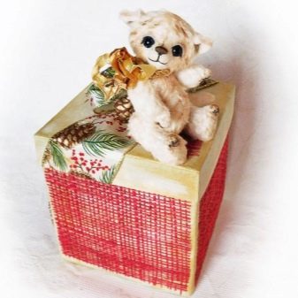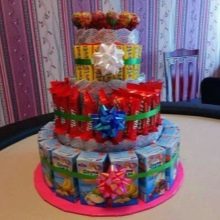 ตัดขาตั้งกระดาษแข็งสามรอบออก: ใหญ่กลางและเล็ก สร้างกระบอกสูบเพิ่มอีกสามกระบอกวางไว้ระหว่างแท่นวางกับกาวเพื่อสร้างหอคอย ในระดับที่ต่ำกว่าวางชุดของน้ำในวงกลมห่อด้วยริบบิ้นและธนู บนชั้นสองให้ติดตั้งช็อกโกแลตแท่งหรือ "บาร์นีย์" และทำคันธนู คุณสามารถวางดอกไม้บนชั้นบนสุดและสร้างความประหลาดใจให้กับคุณได้ มันจะกลายเป็นของขวัญที่งดงามซึ่งแน่นอนว่าจะมีประสิทธิภาพมากกว่าของเล่นใด ๆ