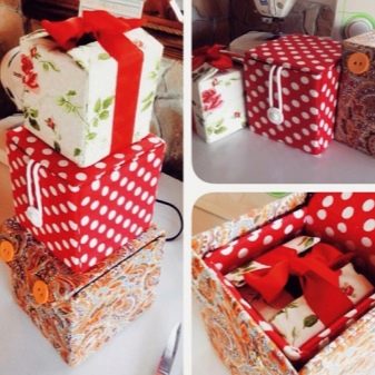กล่องขนมสามารถนำเสนอในลักษณะเดิม ใช้กล่องที่มีขนาดแตกต่างกันสองสามกล่อง ใส่ขนมหวานเล็กน้อยในห่อของขวัญขนาดเล็กปิดและห่อด้วยกระดาษของขวัญ วางในกล่องขนาดใหญ่แล้วโรยด้วยช็อคโกแลตคลุมและห่อด้วยกระดาษทำแบบเดียวกันกับส่วนที่เหลือของกล่องวางในแต่ละขนมที่หลากหลายและตกแต่งที่ใหญ่ที่สุดด้วยโบว์และริบบิ้นที่สดใส