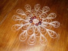 ต่อไปเราติดกาวทั้งลายฉลุกับเกลียว ในขั้นตอนนี้เป็นสิ่งสำคัญที่มือยังคงสะอาดของกาวดังนั้นจึงเหมาะสมที่จะตุนผ้าเช็ดทำความสะอาดเปียก ใช้นิ้วมือของคุณติดกาวหรือถ้าคุณไม่ต้องการให้มือสกปรกด้วยกาวให้ใช้แหนบซึ่งจำเป็นต้องเช็ดด้วยกาวส่วนเกิน เมื่อรูปแบบได้รับรูปทรงนูนแล้วให้ดำเนินการแก้ไข ในครั้งนี้เราจะได้รับความช่วยเหลือจากวงปอกระเจาขนาดเล็กที่สร้างขึ้นเหมือนคนหลักคนแรก แต่มีขนาดที่เล็กกว่า พวกเขาทำหน้าที่ในการยึดองค์ประกอบของผ้าเช็ดปาก