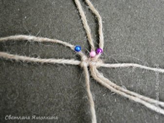 - จากนั้นอีกครั้งเราใช้ด้ายเพิ่มเติมและแก้ไขตรงกลาง นี่เป็นพื้นฐานสำหรับรอบถัดไปของบริดจ์