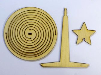 - สิ่งแรกที่คุณจะต้อง ถ่ายโอนภาพเทมเพลตที่กำหนดไปยังพื้นผิวของแผ่นไม้อัด หลังจากนั้นรายละเอียดแต่ละต้นคริสต์มาสในอนาคตจะต้องมีความระมัดระวัง ตัดออก จากฐานหลายชั้น คุณสามารถทำได้ง่ายๆ: โหลดเทมเพลตลงในเครื่องตัดเลเซอร์แบบพิเศษ หากคุณไม่มีเครื่องจักรดังกล่าวอยู่ในสต็อกคุณสามารถถ่ายโอนชิ้นส่วนเทมเพลตทั้งหมดด้วยตนเอง (มักใช้กระดาษติดตามหรือกระดาษคาร์บอน) จากนั้นช่องว่างจะถูกตัดอย่างเรียบร้อย ระมัดระวังเป็นอย่างยิ่งเมื่อทำงานกับรายละเอียดเกลียวของต้นคริสต์มาสในอนาคต เกลียวจะเลียนแบบมงกุฎของต้นไม้ ข้อบกพร่องใด ๆ บนมันจะกลายเป็นชัดเจนทันที