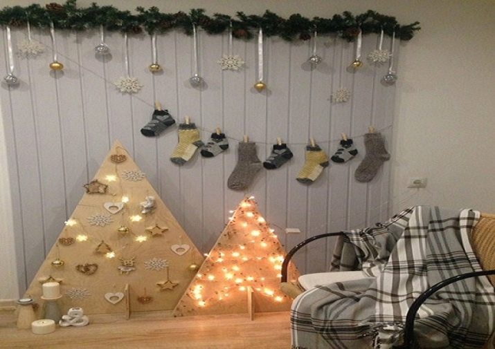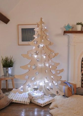 - ไม้อัดต้นคริสต์มาสสามารถทำในวิธีที่ไม่คาดคิดที่สุด นี่อาจเป็นรูปสามเหลี่ยมขนาดใหญ่ที่ไม่มีการทาสี แต่ได้รับการออกแบบมาอย่างดีโดยมีความสูงขนาดใหญ่ติดตั้งใกล้กับกำแพงฟรีในห้อง ในผลิตภัณฑ์คุณสามารถแขวนของตกแต่งปีใหม่เล็ก ๆ และวางเทียนติดกับพื้นและแขวนดิ้นใต้ต้นคริสต์มาสสาขาเหนืองานฝีมือ การแก้ปัญหาจะไม่ธรรมดาและน่าสนใจมาก