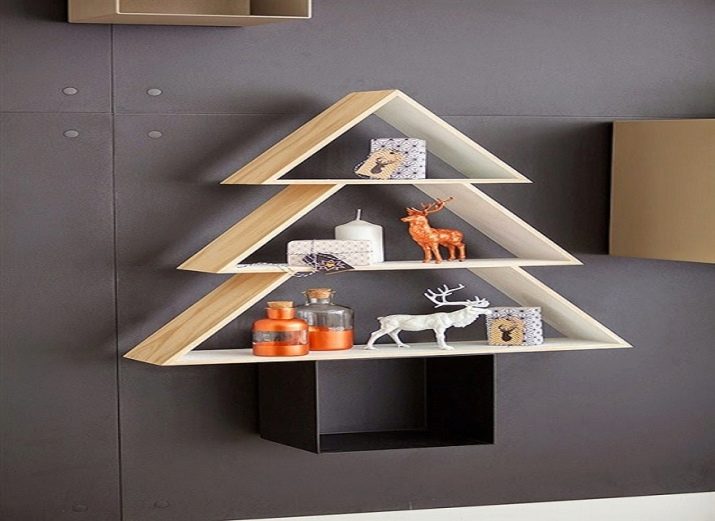- สามารถทำไม้อัดได้หลายชิ้น ต้นคริสต์มาสผนังเล็กส่วนภายในจะถูกเก็บไว้สำหรับชั้นวางขนาดกะทัดรัดสำหรับการตกแต่งปีใหม่ที่หลากหลาย - เทียนตัวเลขและรูปแกะสลัก แบ่งครึ่งสามเหลี่ยมของผลิตภัณฑ์ที่สามารถทำจากไม้อัดแสงและส่วนล่าง (ลำตัว) สามารถทาสีในสีน้ำตาลเข้ม