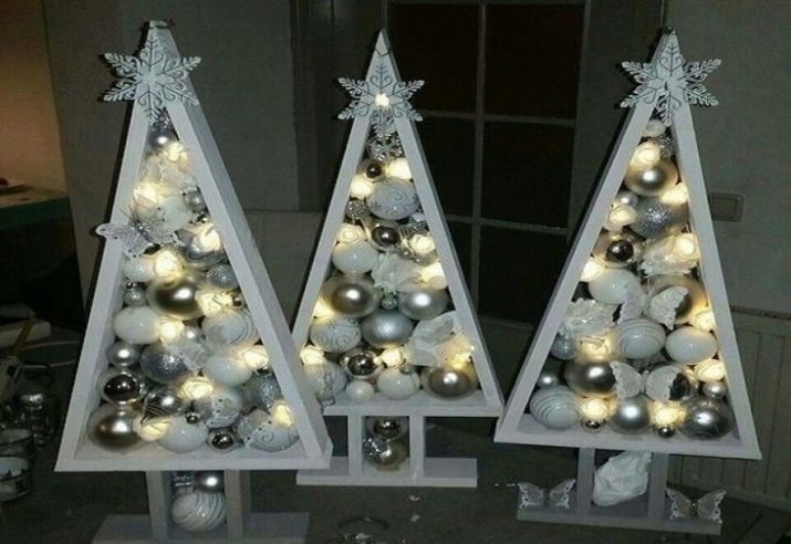 - คุณสามารถทำต้นคริสต์มาสไม้อัดต้นตำรับโดยการสร้างฐานสามเหลี่ยมสีขาวและเติมเต็มด้วยของเล่นคริสต์มาสสีขาวและสีเงิน“ เจือจาง” ด้วยดิ้นดิ้น ต้นคริสต์มาสที่ได้รับการตกแต่งอย่างดีควรตกแต่งด้วยเกล็ดหิมะสีขาวขนาดใหญ่ที่ทำในรูปดาว เพื่อให้โครงสร้างดูสว่างขึ้นและน่าดึงดูดยิ่งขึ้นเป็นที่พึงปรารถนาที่จะเสริมพื้นที่ภายในของพวกเขาด้วยแสงสีต่ำที่มีความสงบ