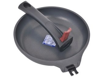 ด้ามจับแบบถอดได้ถือได้ว่าเป็นทางออกที่น่าสนใจ ช่วยให้คุณสามารถใช้อาหารได้ทั้งบนเตาและในเตาอบ แม่บ้านหลายคนเลือกอาหารจานนี้เพราะกระทะที่มีมือจับก็ไม่พอดีกับเตาอบ เป็นที่น่าจดจำว่าตัวเลือกนี้ไม่น่าเชื่อถือ ที่จับที่ถอดออกได้สามารถถอดออกได้อย่างเป็นธรรมชาติในช่วงเวลาที่ไม่เหมาะสมที่สุด