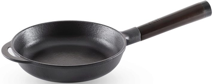 เหล็กหล่อเหมาะสำหรับการปรุงอาหารประเภทเนื้อสัตว์ วัสดุที่ได้รับความร้อนอย่างสม่ำเสมอและรักษาอุณหภูมิเป็นเวลานาน กระทะทอดที่ทนต่อการสัมผัสกับโลหะหรือสารกัดกร่อนอย่างใจเย็นและไม่กลัวที่จะตกลงมาจากความสูงที่น่าประทับใจ เหล็กหล่อไม่เพียงปลอดภัย แต่ยังแข็งแรง ผลิตภัณฑ์ในกระบวนการแปรรูปจะดูดซับธาตุเหล็กจำนวนเล็กน้อยซึ่งจำเป็นต่อร่างกาย
