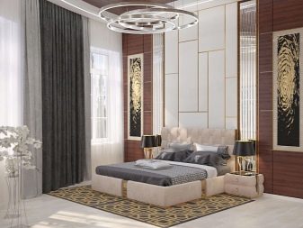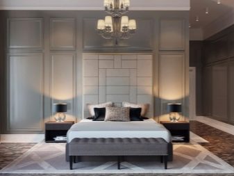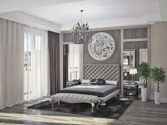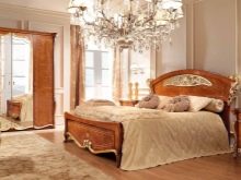 ภาพนี้แสดงให้เห็นถึงวิธีการแก้ปัญหาที่แตกต่างอย่างสิ้นเชิงในจิตวิญญาณ - ไม่มีสิ่งที่น่าสมเพชและตกแต่งที่สดใส มีเพียงเครื่องประดับรูปทรงเรขาคณิตที่รอบคอบถักทออย่างกลมกลืนบนหัวเตียงและเข้าหาฐานสร้างความหรูหรา ตู้และโต๊ะดูเรียบง่าย แต่ยังคงมีสิ่งที่หรูหราในรูปลักษณ์ของพวกเขาอยู่