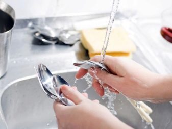 เครื่องดื่มคิวโปรนิกส์และเครื่องเงินที่รักรวมถึงผลิตภัณฑ์จากนิกเกิลเงินจะต้องล้างหลังจากล้างด้วยสารละลายโซดาซึ่งจะมีโซดา 50 กรัมต่อน้ำหนึ่งลิตร โลหะมีค่าต้องได้รับการดูแลเป็นพิเศษสำหรับวางเครื่องประดับและผ้าเช็ดทำความสะอาดซึ่งจะช่วยรักษารูปลักษณ์อันสูงส่งของอุปกรณ์เสริม หากส้อมและมีดมีองค์ประกอบเซรามิกหรือเคลือบฟันแล้ว ไม่ควรล้างด้วยเครื่องล้างจาน แต่ควรล้างออกด้วยมือ