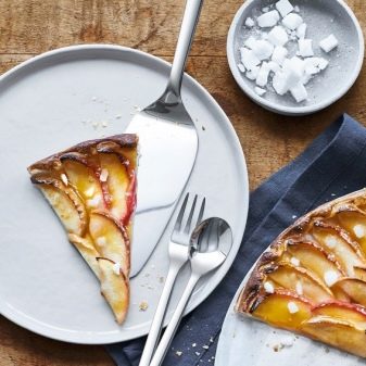มีดสำหรับของหวานมีขนาดเท่ากับเส้นผ่าศูนย์กลางของจานขนม ช้อนควรสั้นกว่านี้เล็กน้อย ส้อมในกรณีนี้สวมมงกุฎ 3 กลีบ มีดและส้อมขนมหวานที่จะให้บริการ: