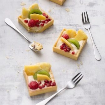 อุปกรณ์ผลไม้มีขนาดเล็กกว่าของหวาน ส้อมผลไม้ไม่มี 3 แต่มี 2 กลีบ ด้ามของเธอเหมือนมีด ช้อนกาแฟไม่เพียง แต่ใช้สำหรับการทำกาแฟเท่านั้น แต่ยังใช้เมื่อทำงานกับชากับผลไม้ปั่นแม้กระทั่งเกรพฟรุตและไข่ลวก