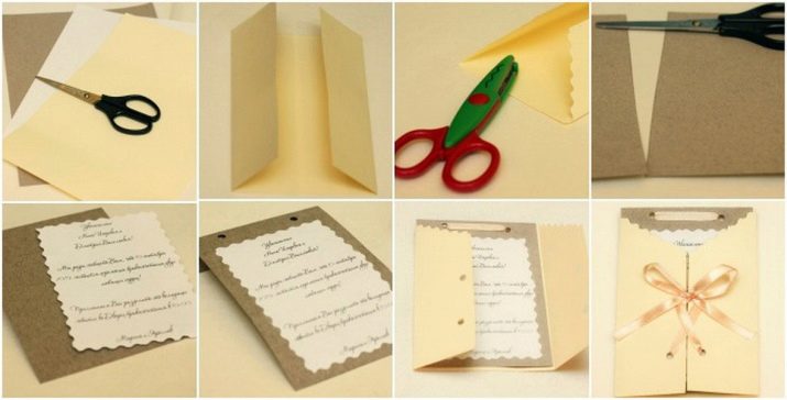 ก่อนอื่นให้ตัดสินใจว่าฟอร์แมตการ์ดเชิญของคุณจะเป็นแบบใด จากนั้นเลือกข้อความเพื่อเติมการ์ดพิมพ์ลงบนช่องว่าง โดยปกติแล้วการเชิญ 2 ครั้งนั้นทำจากแผ่น A4 ขนาดนี้เหมาะสมที่สุดหากขอบของคำเชิญเป็นลอนหรือแกะสลักแล้วขั้นตอนที่สองจะเป็นการตัดเค้าร่างตามรูปวาด คุณสามารถทำรูด้านบนและผูกโบว์ซาตินเล็ก ๆ ได้